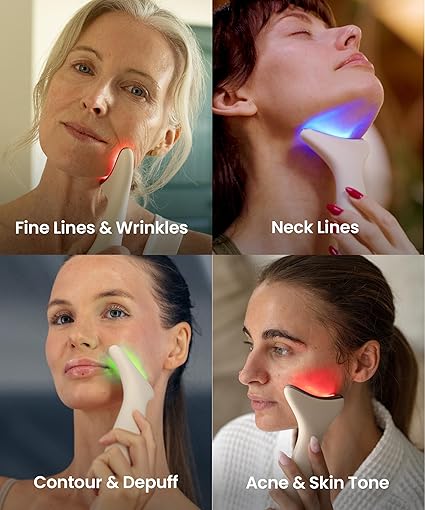 - Use it on your face and neck to improve elasticity, combat fine lines & wrinkles, tech neck, hyperpigmentation, puffiness, and uneven skin tones with 3 powerful LED therapies; Red Light, Green Light, and Blue Light thearpy.